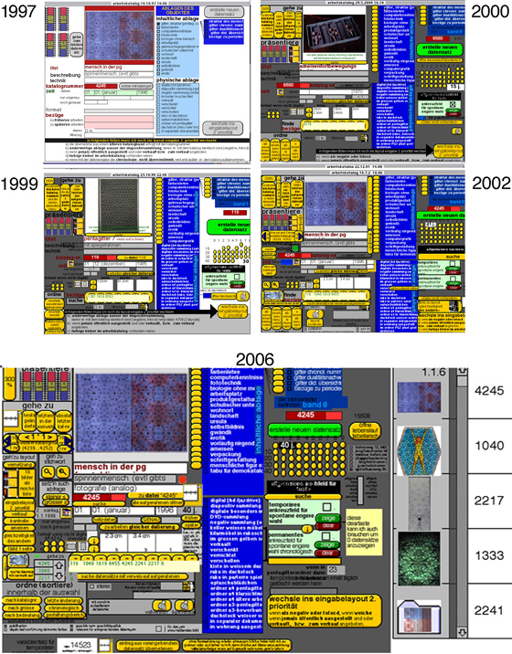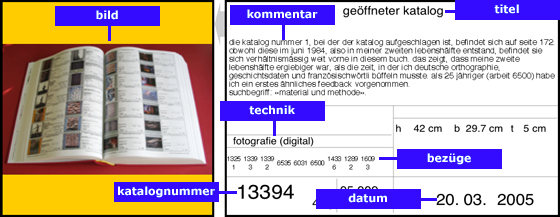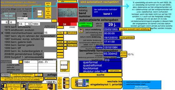 polyhierarchische vernetzung: der arbeitskatalog ordnet mein tun. er ist skizzenbuch und lernjournal in einem und zeigt immer wieder neue zusammenhänge. von beliebig vielen arbeiten kann auf eine einzige arbeit verweisen werden, jede arbeit kann auf bis zu 10 andere arbei-ten verweisen. als wären es zellen eines organismus, kann ich alles, was ich in meinem leben bildnerisch gestaltet habe, analysieren und als objekt auf einfachste art («drag and drop» der katalogsnummer in die vernetzungsfelder anderer arbeiten) weiter verknüpfen. trotz hoher komplexität des datenbanksystems motiviert die einfache anwendung. weil das werk aber, je umfangreicher es wird, desto anfälliger auf eine fehlbedienung wird, und eine fehlmanipulation nicht unmittelbar danach erkannt zu werden braucht, wird der katalog seit einiger zeit mit der timemachine stündlich abgesichert. auch wenn die datenbank zur zeit über 24’000 nummern umfasst, ist sie mit all ihren relationalen verbindungen noch auf einer DVD speicherbar. sporadische sicherheitskopien stellen eine günstige viren- und brandschutzversicherung dar.
