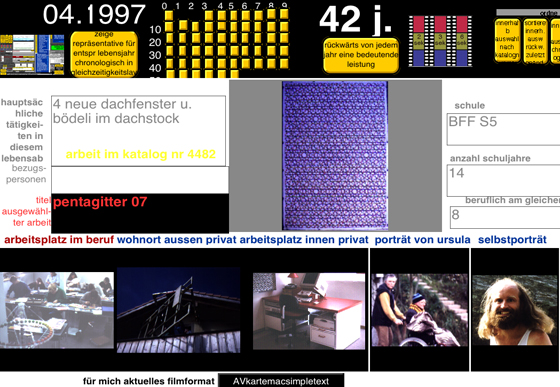 seit ich 1996 mit einem computer und einer datenbank umzugehen lernte, wird der katalog elektronisch erfasst. nach 6 jährigem provisorium liegt seit dem oktober 2002 rückwirkend der vollständige katalog elektronisch und auch nach katalognummer geordnet in physischer qualität vor. dank des inzwischen jederzeit möglichen ausdrucks hat sich die mobile version der stellverterter auf postitklebern erübrigt. filme sind unabhängig davon, ob sie mit normal8, super8, video8, VHS oder VHS-C-videobändern aufgenommen wurden, in digitalem format abgelegt. jede elektronisch vorliegende datei kann mit knopfdruck aus der datenbank direkt geöffnet werden. viele funktionen des betriebssystems werden komfortabel über die datenbank gesteuert.